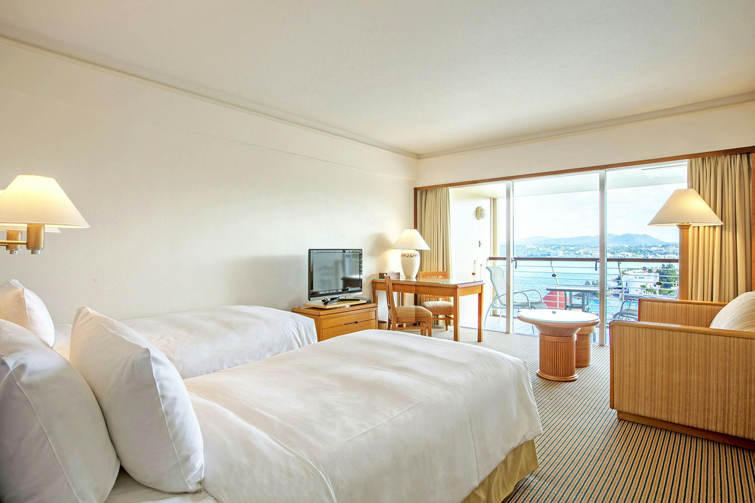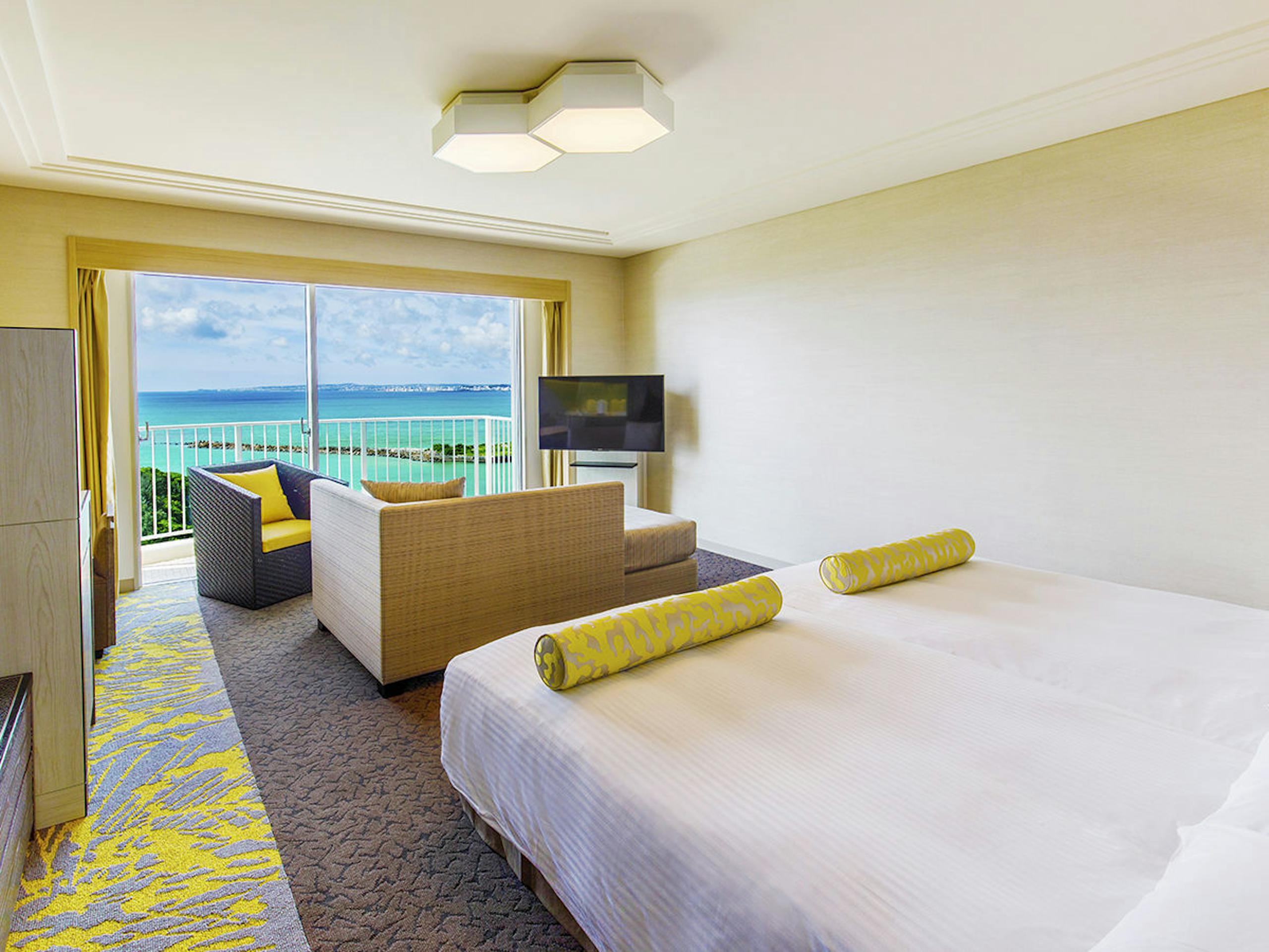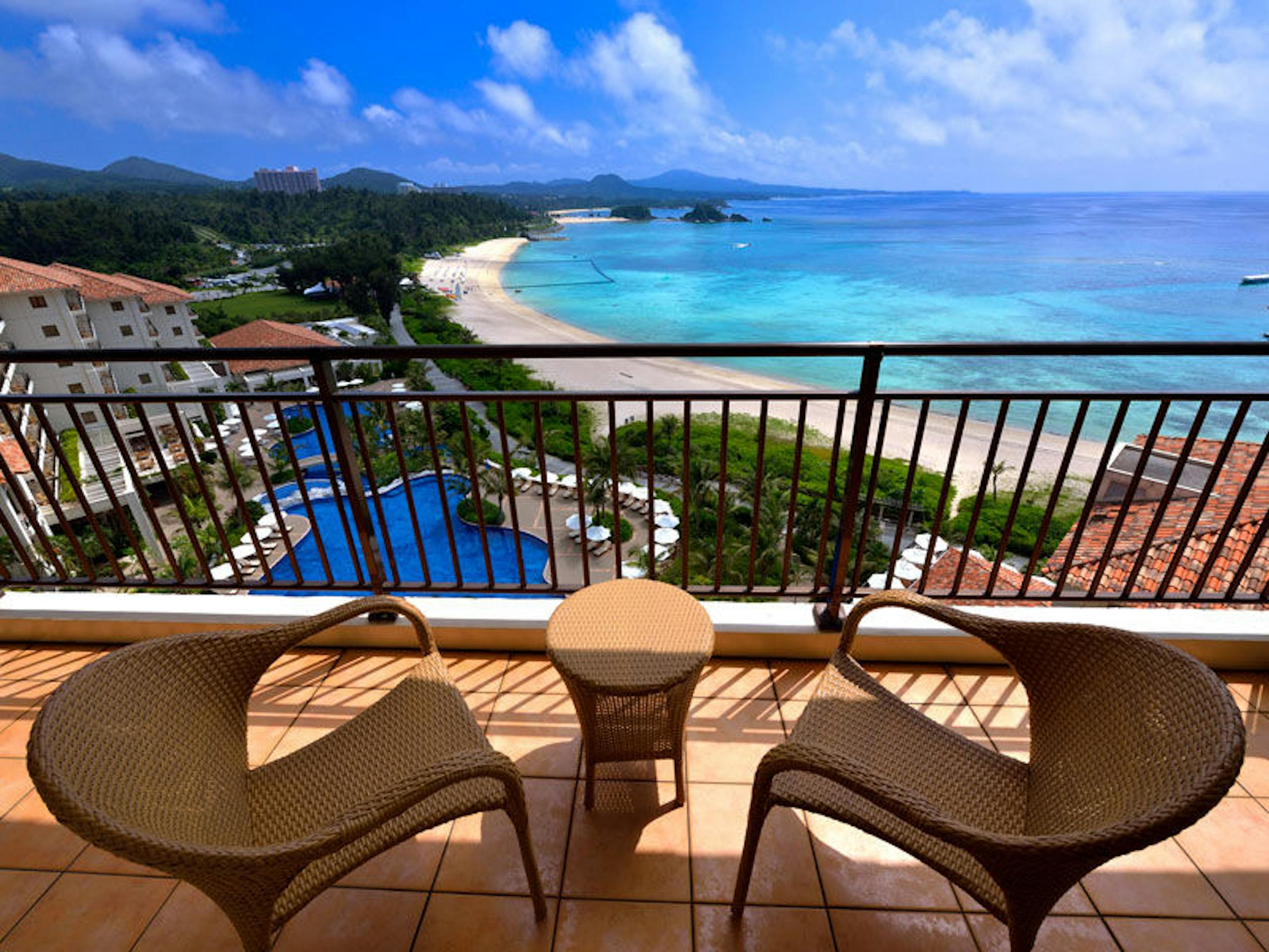 客室からはガーデンプールや万座ビーチ、対岸の万座毛などを一望できます。