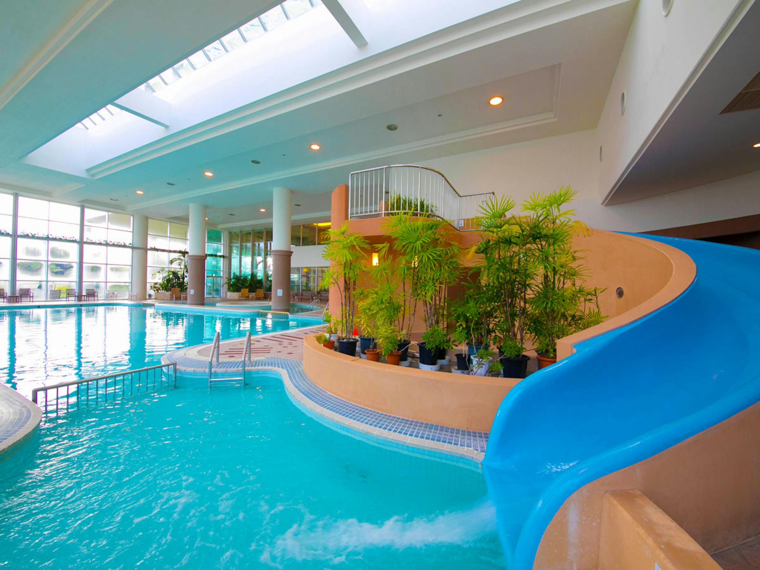 温水ジャグジー付きの屋外プール、1年中泳げる天然温泉の室内プールがあります。