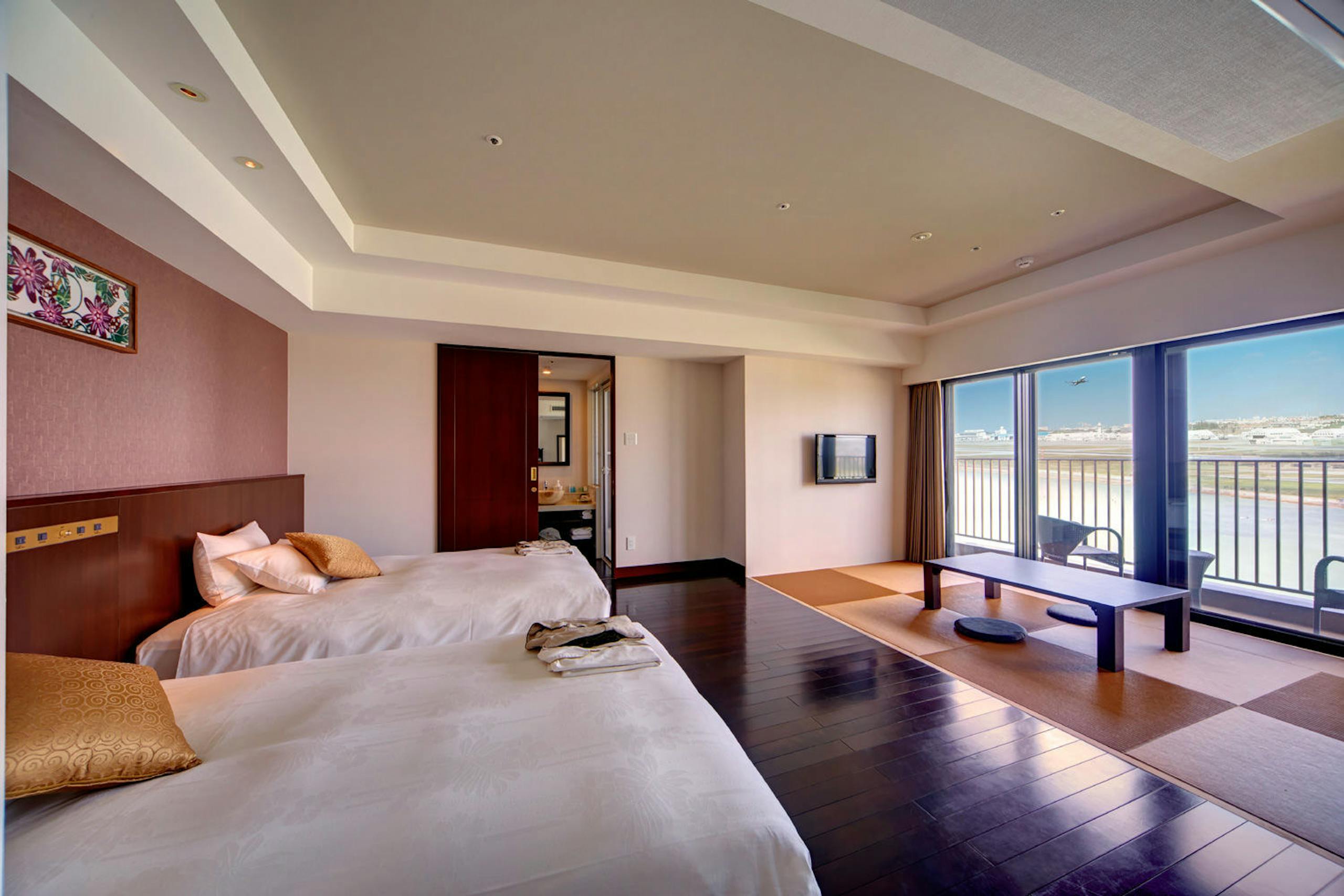 空港側の客室からは迫力ある那覇空港の滑走路や飛行機を海の向こうに眺めることができます。