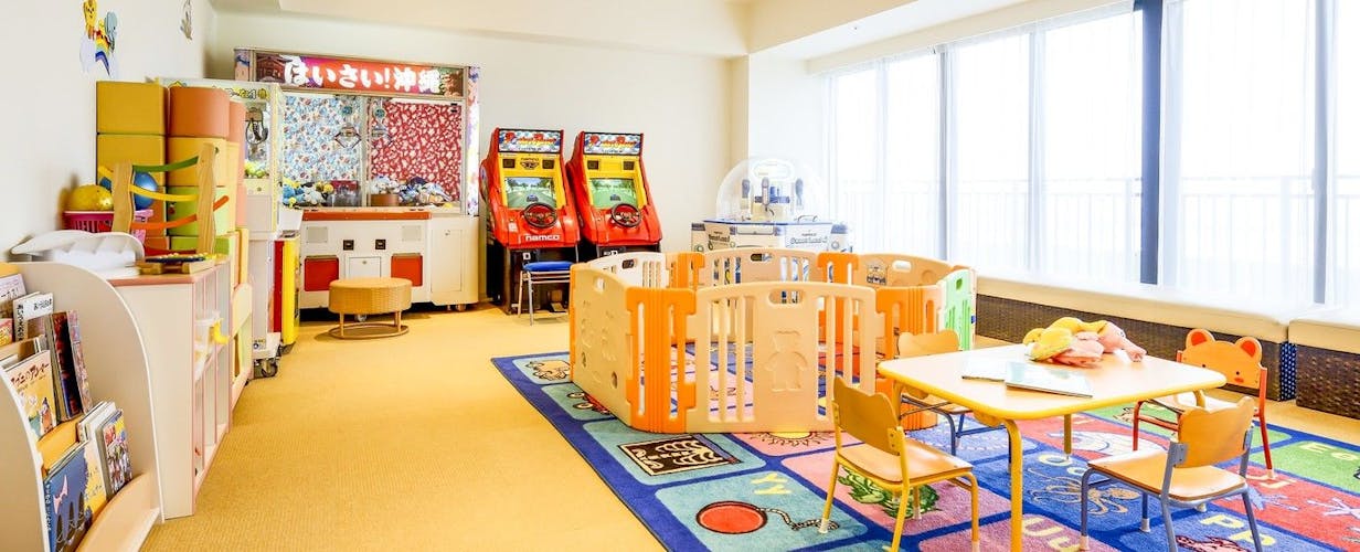バイキングレストラン内にはキッズスペースがあるので食事中に子供が飽きてしまっても安心。ホテル内には他にも有料の万座キッズプレイランドがあります。