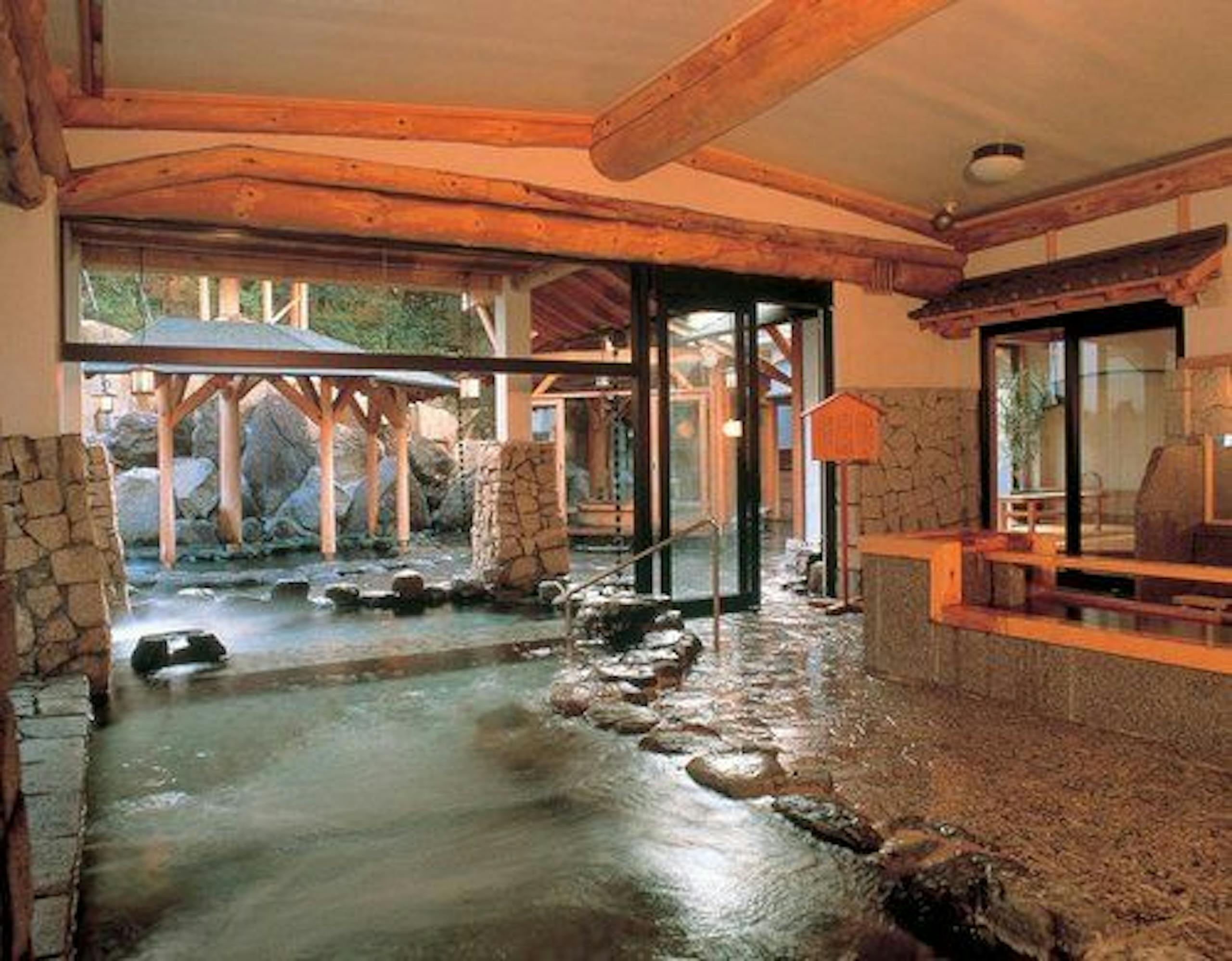 ホテル おかだ館内の大浴場には内湯と露天風呂がひとつずつ、そして滞在中は自由に入れる日帰り温泉施設「湯の里おかだ」には露天のジェット風呂、プラズマ湯、泡風呂など盛りだくさん。もちろんすべて温泉です。